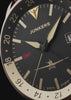 Die Junkers Flieger GMT Automatik 966.01.02 vereint klassisches Design mit moderner Technik. Das bronzefarbene Edelstahlgehäuse misst 42 mm im Durchmesser und ist bis 20 ATM wasserdicht. Durch den verschraubten Gehäuseboden mit Glasfenster lässt sich das präzise Automatikwerk Seiko NH34A gut erkennen.