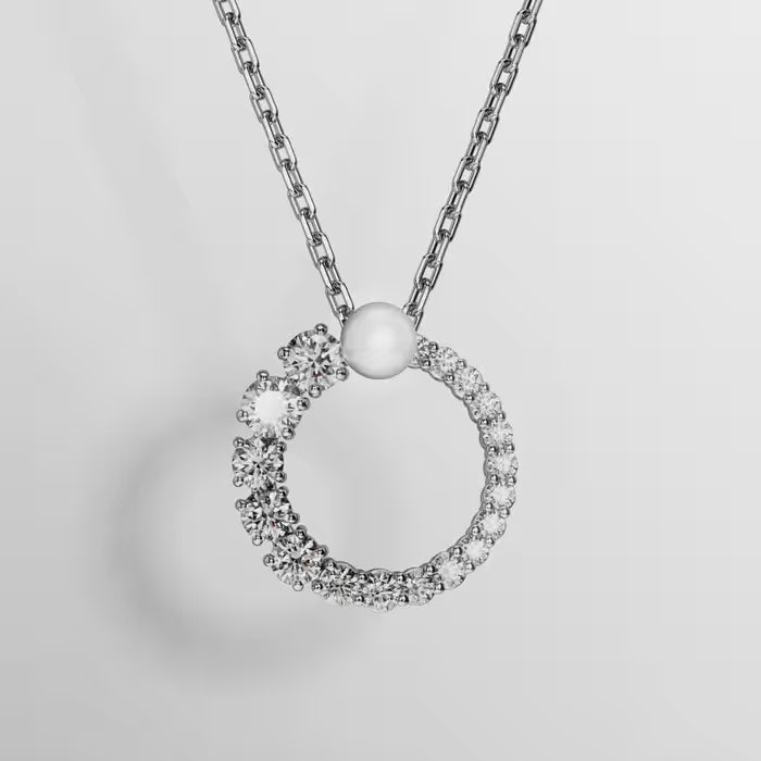 Diese stilvolle Halskette aus der Swarovski Matrix Kollektion besticht durch ihr edles, rhodiniertes Finish in silberfarbenem Glanz. Im Mittelpunkt steht ein kreisförmiger Anhänger, der mit funkelnden Zirkonia-Steinen in sanftem Größenverlauf besetzt ist und durch eine schimmernde, weiße Kristallperle im Zentrum abgerundet wird. Die feine Kette lässt sich in der Länge von 38 bis 45 cm verstellen und wird sicher mit einem Karabinerverschluss getragen.